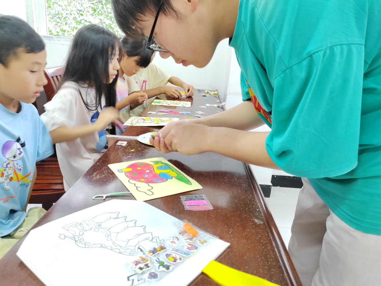 图为实践队员与孩子们一起画沙画
