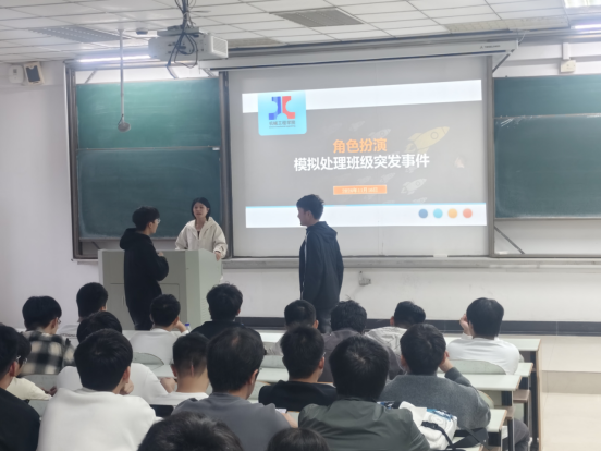 在佳山校区教三南404举行班级学生干部能力提升培训班第三期,2024级新生辅导员陈洁以角色扮演的活动形式模拟处理班级突发事件,2024级全体班委成员和团支部委员参加。