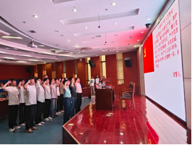 随后,在领誓人吴文兵的带领下,新党员进行入党宣誓。面向鲜红的党旗,党员们举起右拳,庄严宣誓,誓言铿锵,表达了对党的忠诚以及为共产主义奋斗终身的坚定决心。紧接着,党委委员、副院长饶思贤宣读了表彰决定。