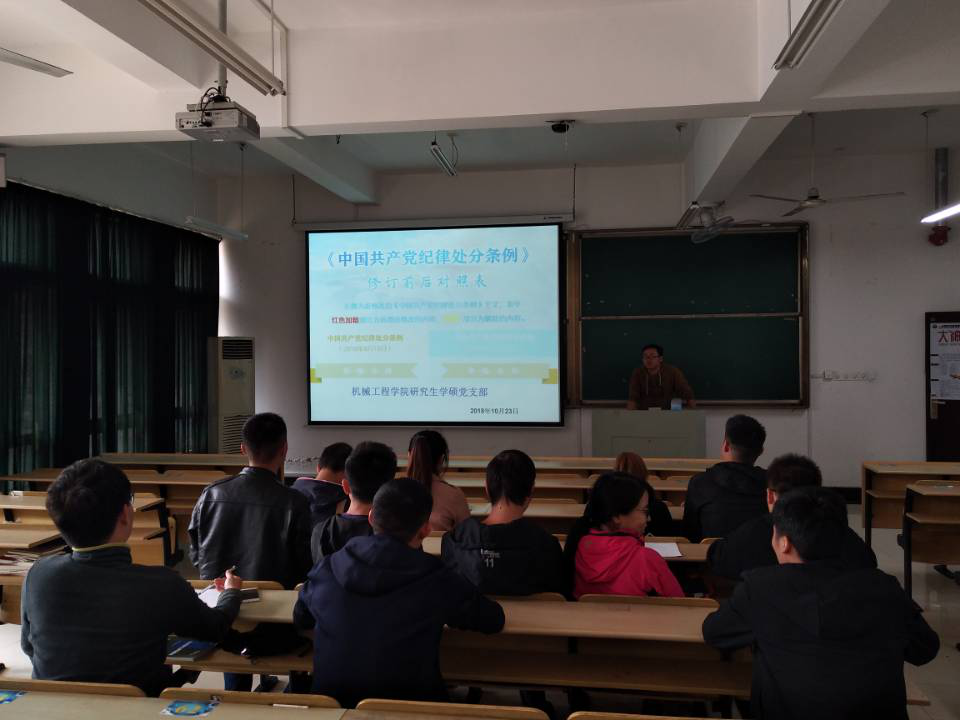 研究生学硕党支部于机械楼405教室集中学习了新修订的《中国共产党纪律处分条例》(以下简称《条例》),会议由党支部书记杨龙主持。