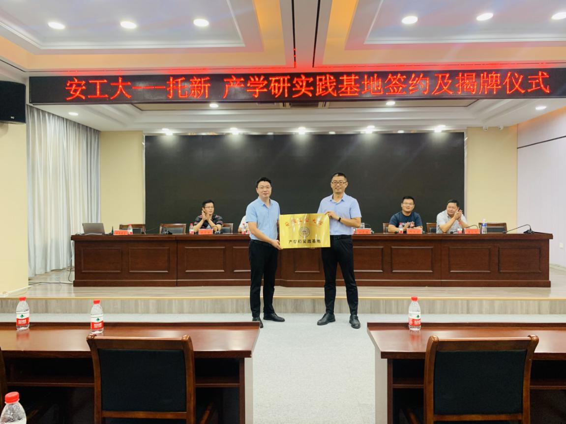 对托新公司在技术、人才等多方面的支持。希望双方在人才培养与就业、实习实践、产学研合作和项目申报等方面加强合作,提升企业创新、创造和成果转化能力。郑近德和陈龙宝分别代表双方单位在产学研实践基地协议上签字,并共同为“安徽工业大学产学研实践基地”揭牌。
