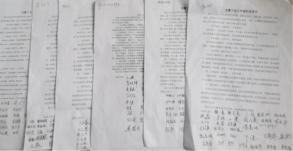会上,各班班主任或辅导员结合国家和社会的发展强调了诚信对国家稳定、社会和谐的重要意义,结合诚信考试、学术诚信、诚信偿还助学贷款、求职诚信等与大学生密切相关的行为,强调了诚信对个人的重要性。同时结合案例向同学们介绍了部分同学的不诚信行为给自己及他人带来的危害,带领大家学习了大学生应遵守的诚信规范,要求同学们遵纪守法、讲诚信重信用、诚信做事、诚实做人。会后,各班同学现场签订了“安徽工业大学诚信承诺书”,承诺学习诚信、经济诚信、生活诚信、交往诚信、网络诚信、就业诚信等。最后各班发出诚信共勉:履约践诺,以信立人,弘扬正气。