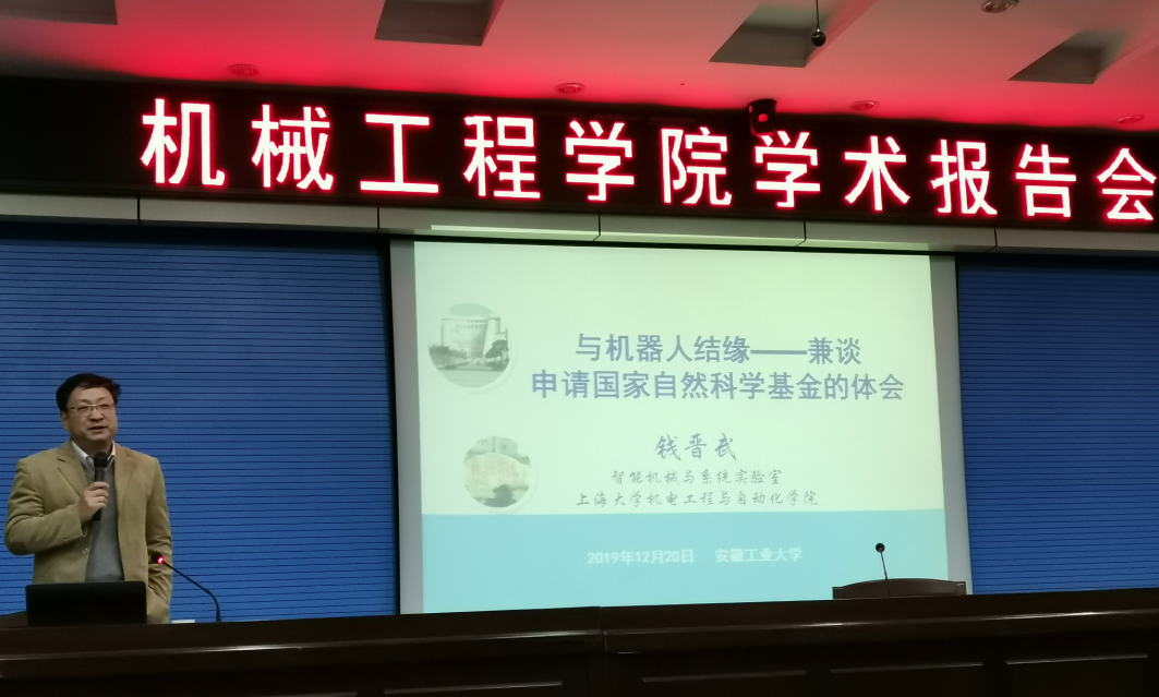 12月20日,上海大学钱晋武教授来我院为广大师生做了题为《与机器人结缘——兼谈申请国家自然科学基金的体会》的学术报告,报告由刘庆运主持。