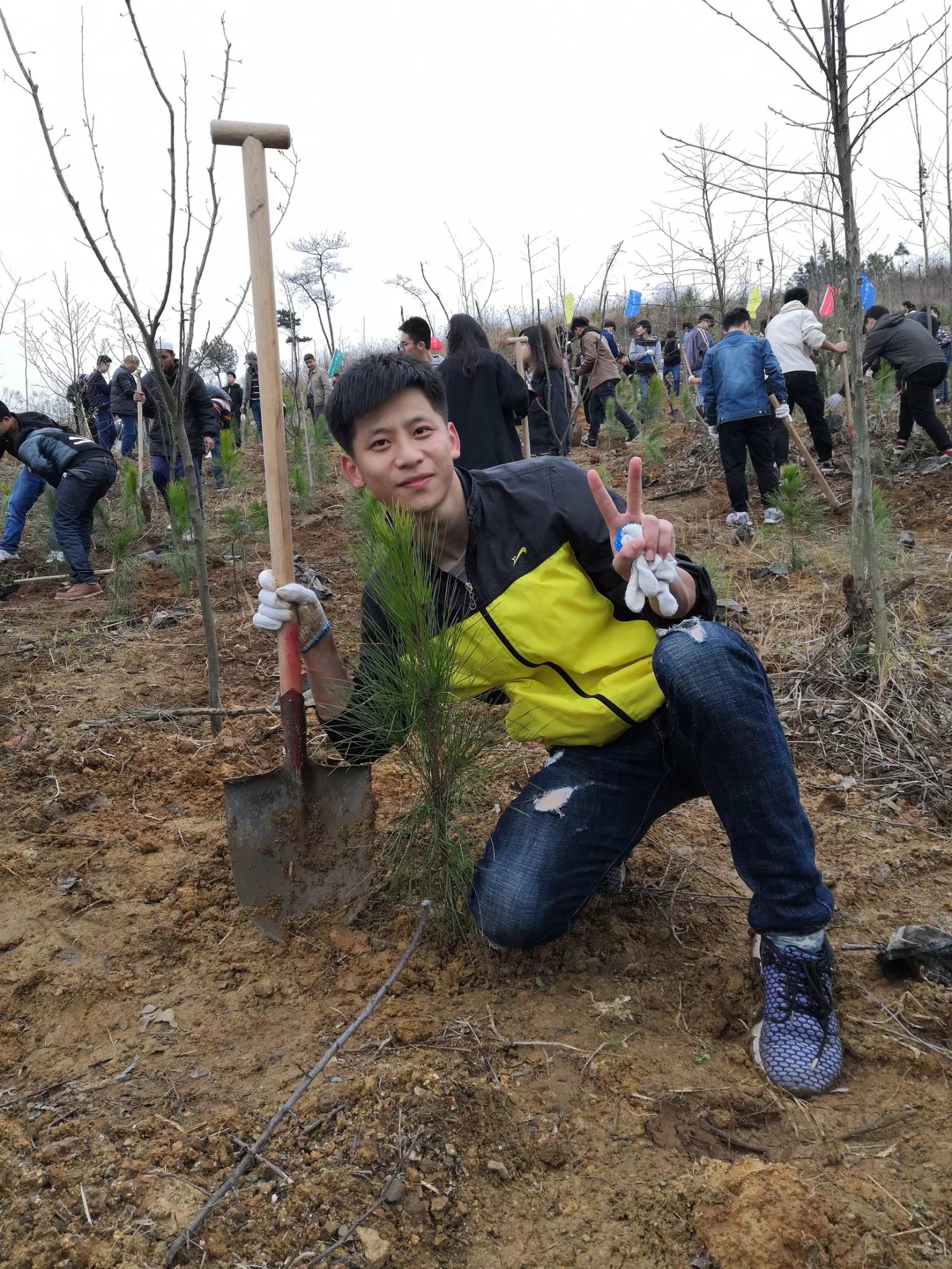 挖坑,捣土,放苗,踩实,同学们分工合作,忙的不亦乐乎。望着一棵棵绿色小树苗渐渐布满秀山校区的山头,喜悦之情难以言表。