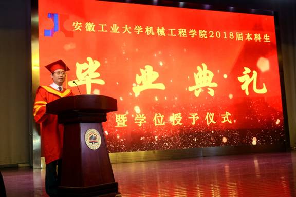 魏先文作了热情洋溢的讲话。他代表学校向圆满完成学业的毕业生表示祝贺并致以良好的祝愿。他说,今年是学校60周年华诞。60年来,8000多名机械学子怀揣梦想,积极投身到建设祖国的大潮中,在他们中,涌现出一批又一批的先进典型。希望同学们以他们为榜样,见贤思齐,比学赶超。一是要有追求理想的情怀。大学毕业了,但青春没有毕业,希望同学们直面现实,投身实践,拼搏进取,做生活的强者,以乐观向上的信念、百折不挠的精神面对一切。二要有追求卓越的坚持。希望同学们始终坚持和弘扬“精工博学、厚德敏行”校训精神,自觉做安工大精神的传承者、践行者和守护者,勇于探索,敢于创新,自强不息,追求卓越。三要有对社会的责任和爱。希望同学们怀揣一份对社会的爱和责任,既志存高远,又脚踏实地;既顺应潮流,又勇于担当,将个人的梦想融入民族复兴的中国梦,在中国特色社会主义伟大实践中焕发青春的光彩。