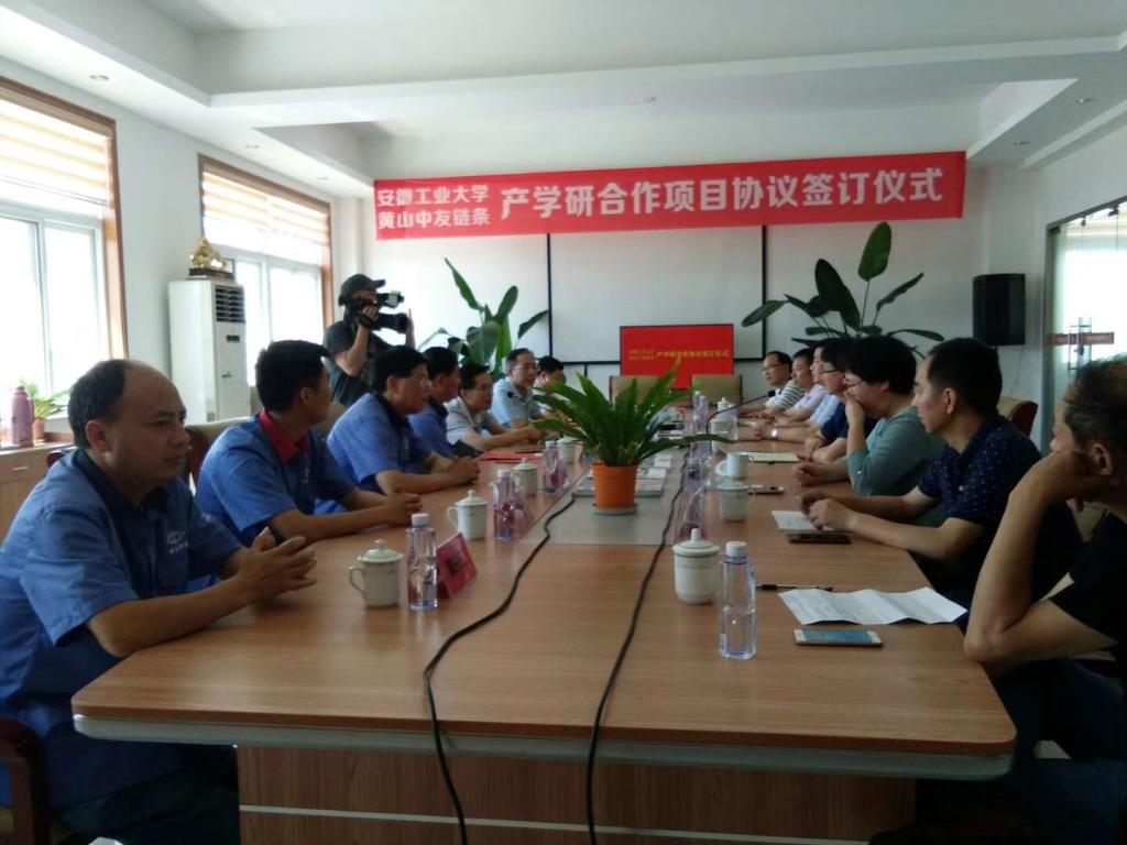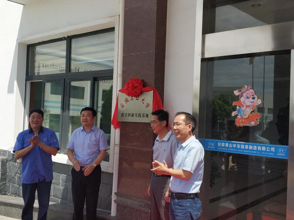 党委书记徐柳根、副院长汪永明、项目技术负责人谈莉斌一行,赴绩溪县黄山中友链条制造有限公司,出席安徽工业大学教学科研实践基地挂牌暨产学研合作签字仪式。绩溪县分管领导姚强副县长,县科技局、经信委、园区负责人等出席见证。