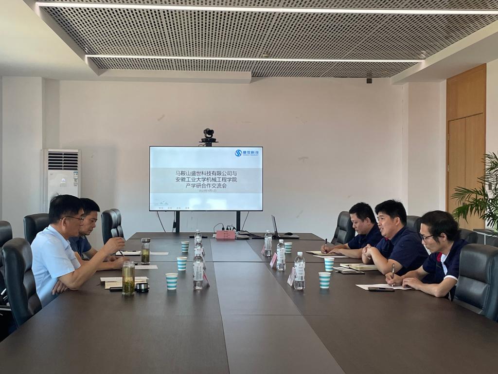 刘成士董事长对吴文兵一行表示热烈欢迎。双方首先进行了座谈交流,刘董事长详细介绍了公司的发展现状、主要业务、发展前景等情况,希望能与机械学院开展产学研深度合作,并为企业提供人才支撑。刘庆运院长就学校学院历史、办学特色、科研平台、学科专业等情况做了详细介绍,希望借此契机推动产学研一体化发展,未来在科研平台、项目申报、科技成果转化等方面与盛世科技有限公司开展深度合作。吴文兵书记表示高校企业一家亲,希望双方在产学研、就业实习基地等方面加强深层次沟通,扩大战略合作,为马鞍山经济发展、吸纳人才做出校企贡献。