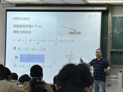段士伟老师的讲课内容为动力学普遍定理中的动能定理,段老师从经典的牛顿第二定律出发,结合力学发展史,引入动力学普遍定理中的动能定理,并结合“大国重器”等工程案例,着重介绍了动能定理在动力学问题中的应用和注意事项,巧妙的将工程案例和典型人物融入教学内容中,发挥了课程思政的育人作用,激发学生的爱国情怀。