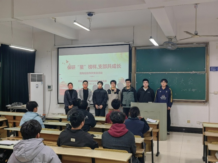 本科生第二党支部在机械楼 405 开展 “保研‘星’榜样,支部共成长” 推免经验传承主题党日活动。活动邀请保研至中南大学的周俊辰、保研至天津大学的朱振国两位优秀党员分享,党支部书记童辉辉主持,支部全体党员参与。