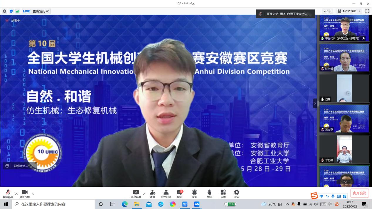 受疫情影响,本次省赛参赛选手采取线上答辩与演示、专家采取线上评审的方式进行。竞赛历时2天,来自全省23所本科高校184支代表队,900余名师生参加了“仿生机械”和“生态修复机械”2个类别的比赛。本次比赛共评选出安徽省赛区一等奖28项,二等奖37项,三等奖46项。好色网